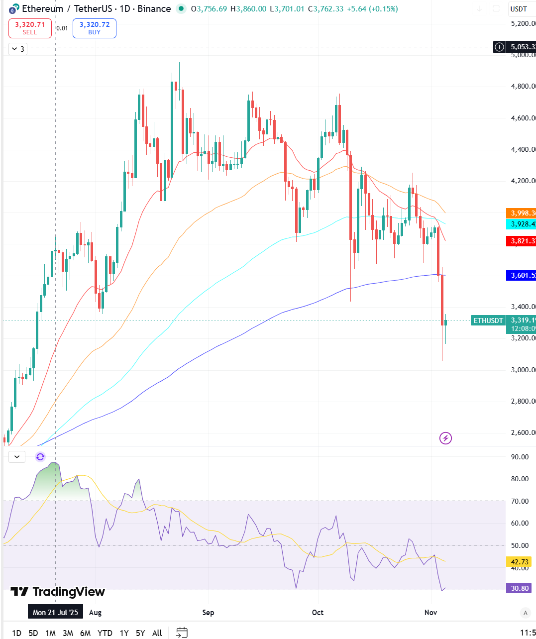 이더리움은 하락세가 더 심하다. 8월 $4,800를 기록했으나, 현재는 $3,317로 △30%가 하락했다. $3,100 정도까지 터치를 했다가 살짝 반등하여 현재는 $3,317이다 (2025.11.05 기준).